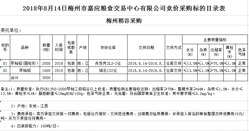 交易時(shí)間和地點(diǎn):2018年8月14日(星期二)上午10時(shí)15分。廣東省梅州市彬芳大道南161號梅州市糧食交易中心3樓。