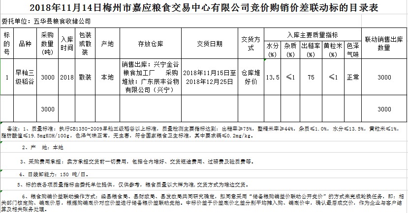 受客戶委托,梅州市嘉應(yīng)糧食交易中心有限公司定于2018年11月14日(星期三)舉辦稻谷購銷價差聯(lián)動標(biāo)的交易會,五華縣糧食收儲公司擬銷售和采購早秈稻3000噸。