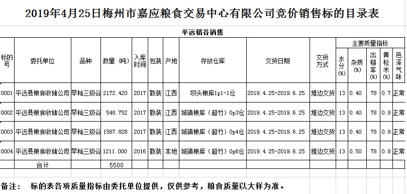 交易時間和地點:2019年4月25日(星期四)上午10時。廣東省梅州市彬芳大道南161號梅州市糧食交易中心3樓。
