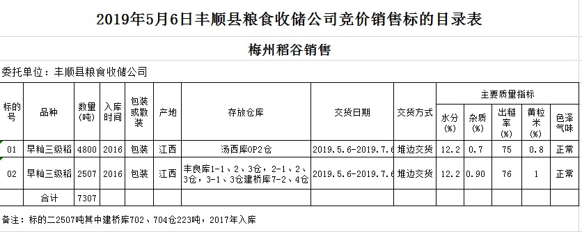 受客戶委托,梅州市嘉應糧食交易中心有限公司定于2019年5月6日(星期一)舉辦糧食競價交易會,豐順縣糧食收儲公司擬銷售2016年早秈稻7084噸2017年早秈稻223噸。