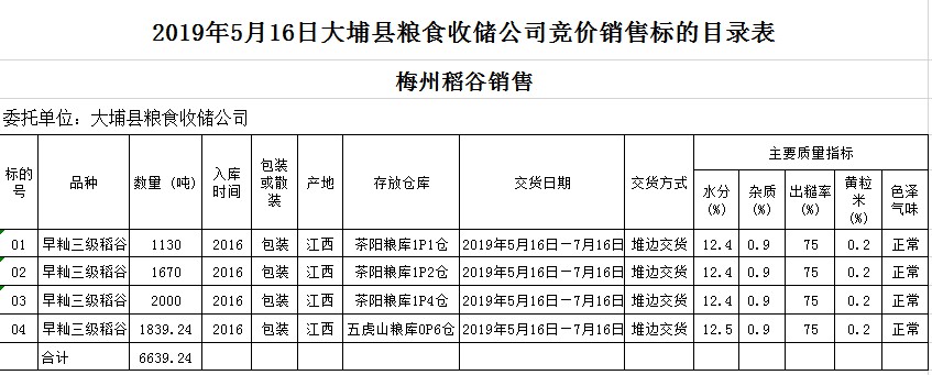 受客戶委托,梅州市嘉應(yīng)糧食交易中心有限公司定于2019年5月16日(星期四)舉辦糧食競(jìng)價(jià)交易會(huì),大埔縣糧食收儲(chǔ)公司擬銷(xiāo)售2016年早秈稻6639.24噸。