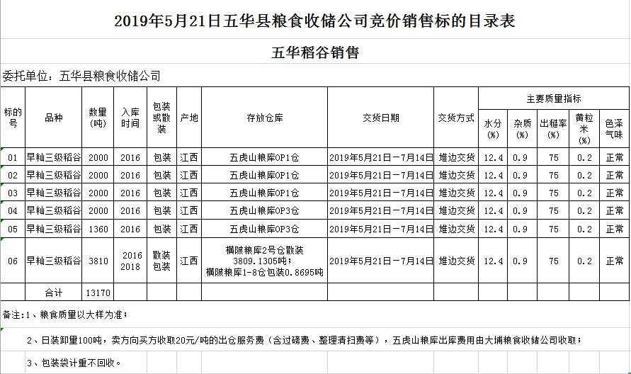 受客戶委托,梅州市嘉應(yīng)糧食交易中心有限公司定于2019年5月21日(星期二)舉辦糧食競價(jià)交易會,廣東省五華縣糧食收儲公司擬銷售2016年早秈稻13169.1305噸,2018年早秈稻0.8695噸。
