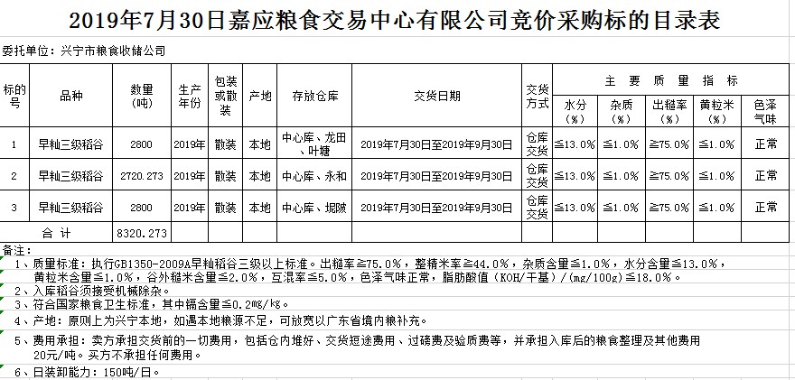 受客戶委托,梅州市嘉應(yīng)糧食交易中心有限公司定于2019年7月30日(星期二)舉辦糧食競價交易會,興寧市糧食收儲公司擬采購2019年早秈稻8320.273噸。