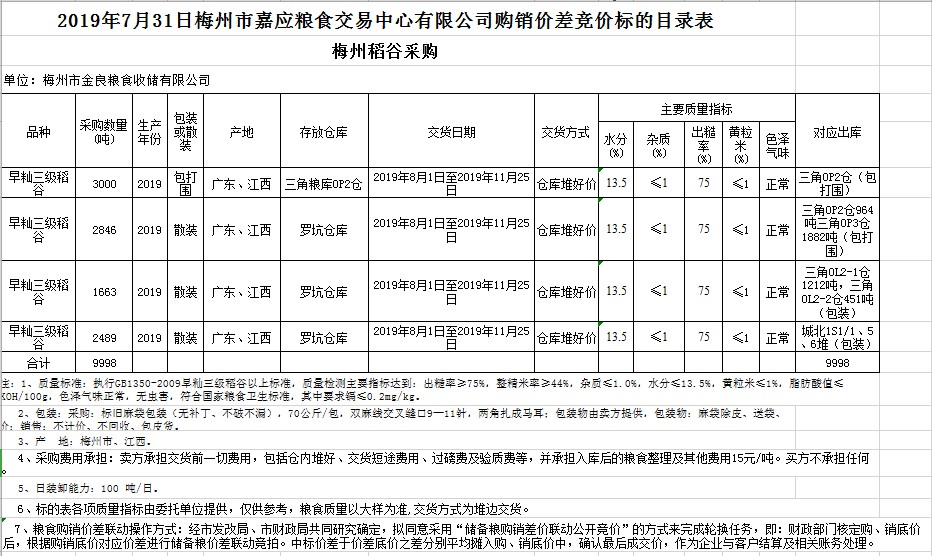 受客戶委托,梅州市嘉應(yīng)糧食交易中心有限公司定于2019年7月31日(星期三)舉辦稻谷購銷價差聯(lián)動標(biāo)的交易會,梅州市金良糧食收儲有限公司擬銷售和采購早秈稻9998噸。