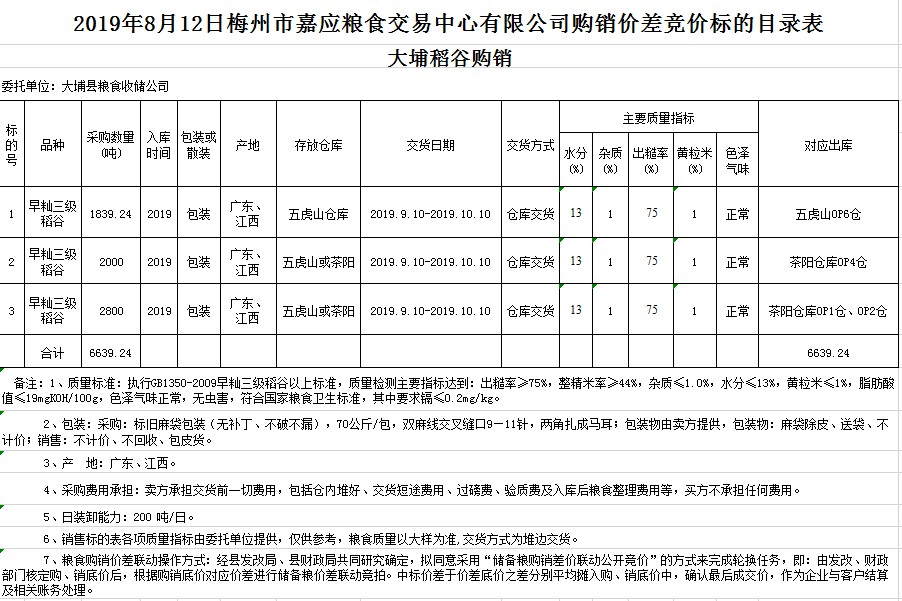 受客戶委托,梅州市嘉應糧食交易中心有限公司定于2019年8月12日(星期一)舉辦稻谷購銷價差聯(lián)動標的交易會,大埔縣糧食收儲公司擬銷售和采購早秈稻6639.24噸。