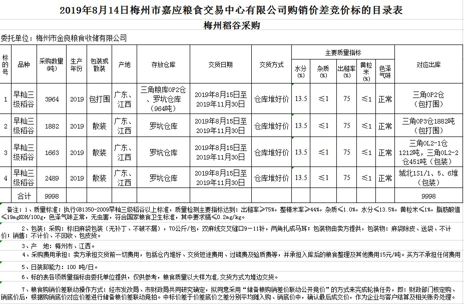 受客戶委托,梅州市嘉應(yīng)糧食交易中心有限公司定于2019年8月14日(星期三)舉辦稻谷購(gòu)銷價(jià)差聯(lián)動(dòng)標(biāo)的交易會(huì),梅州市金良糧食收儲(chǔ)有限公司擬銷售和采購(gòu)早秈稻9998噸。