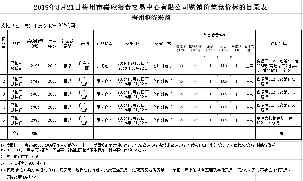 受客戶委托,梅州市嘉應(yīng)糧食交易中心有限公司定于2019年8月21日(星期三)舉辦稻谷購(gòu)銷價(jià)差聯(lián)動(dòng)標(biāo)的交易會(huì),梅州市嘉泰糧食收儲(chǔ)公司擬銷售和采購(gòu)早秈稻9390噸。