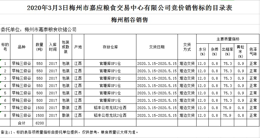 受客戶委托,梅州市嘉應糧食交易中心有限公司定于2020年3月3日(星期二)舉辦糧食競價交易會,梅州市嘉泰糧食收儲公司擬銷售2017年早秈稻6200噸。