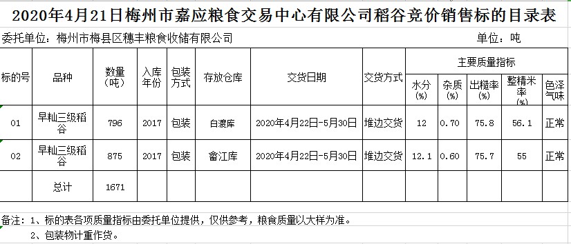 受客戶委托,梅州市嘉應糧食交易中心有限公司定于2020年4月21日(星期二)舉辦糧食競價交易會,梅州市梅縣區(qū)穗豐糧食收儲有限公司擬銷售2017年早秈稻1671噸。