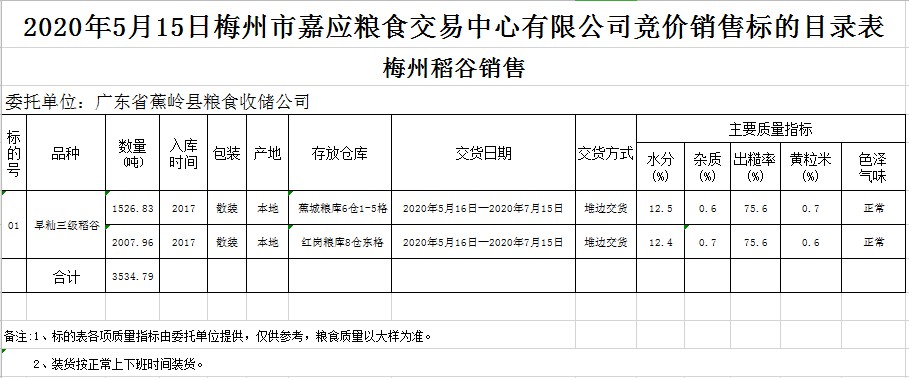 受客戶委托,梅州市嘉應(yīng)糧食交易中心有限公司定于2020年5月15日(星期五)舉辦糧食競(jìng)價(jià)交易會(huì),廣東省蕉嶺縣糧食收儲(chǔ)公司擬銷售2017年早秈稻3534.79噸。