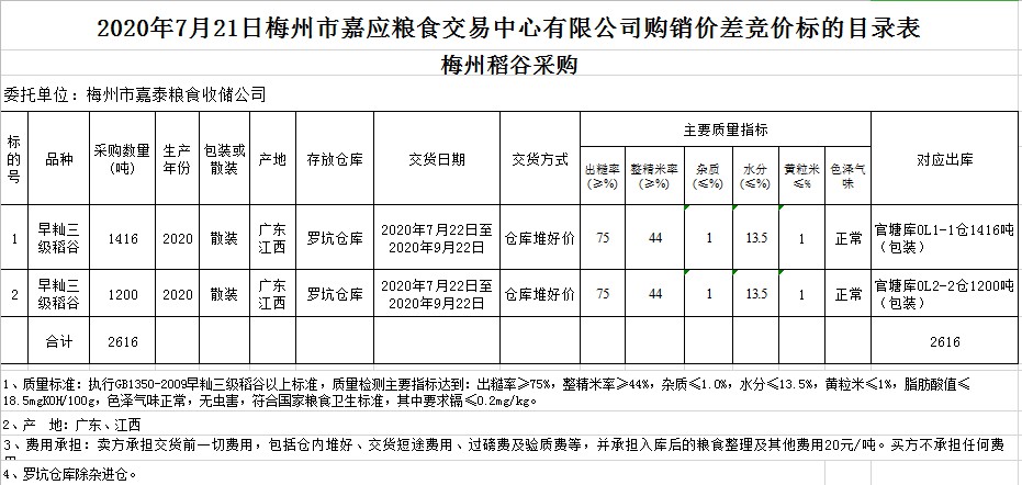 受客戶委托,梅州市嘉應糧食交易中心有限公司定于2020年7月21日(星期二)舉辦稻谷購銷價差聯(lián)動標的交易會,梅州市嘉泰糧食收儲公司擬銷售和采購早秈稻2616噸。