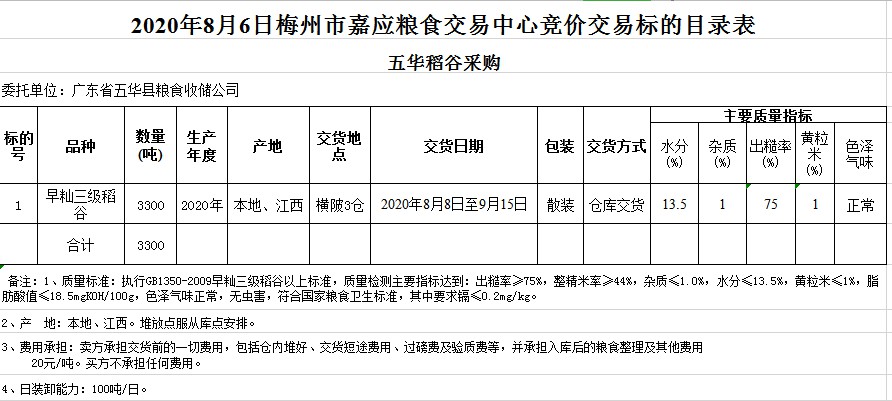 交易時(shí)間和地點(diǎn):2020年8月6日(星期四)上午10時(shí)。廣東省梅州市彬芳大道南161號梅州市糧食交易中心3樓。