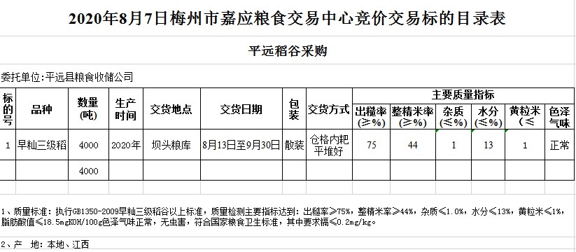 受客戶委托,梅州市嘉應(yīng)糧食交易中心有限公司定于2020年8月7日(星期五)舉辦糧食競(jìng)價(jià)交易會(huì),平遠(yuǎn)縣糧食收儲(chǔ)公司擬采購(gòu)2020年早秈稻4000噸。