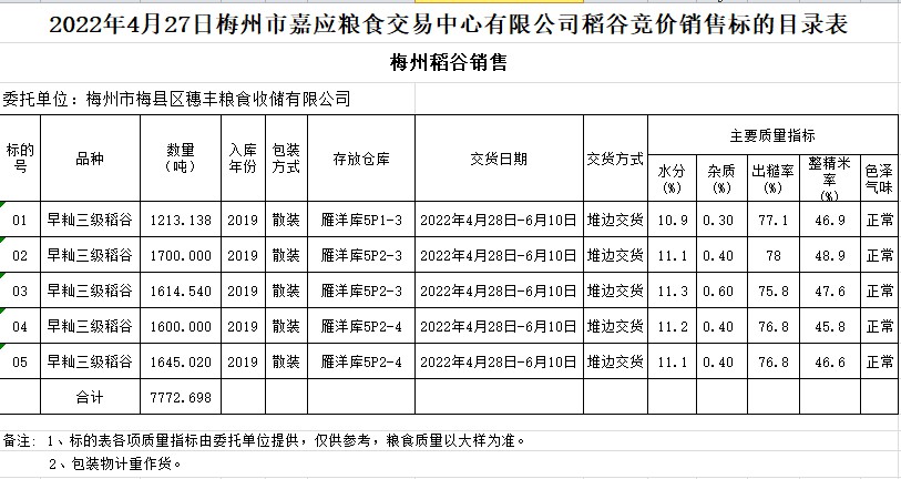 受客戶委托,梅州市嘉應(yīng)糧食交易中心有限公司定于2022年4月27日(星期三)舉辦糧食競(jìng)價(jià)交易會(huì)。梅州市梅縣區(qū)穗豐糧食收儲(chǔ)有限公司擬銷售2019年早秈稻7772.698噸。