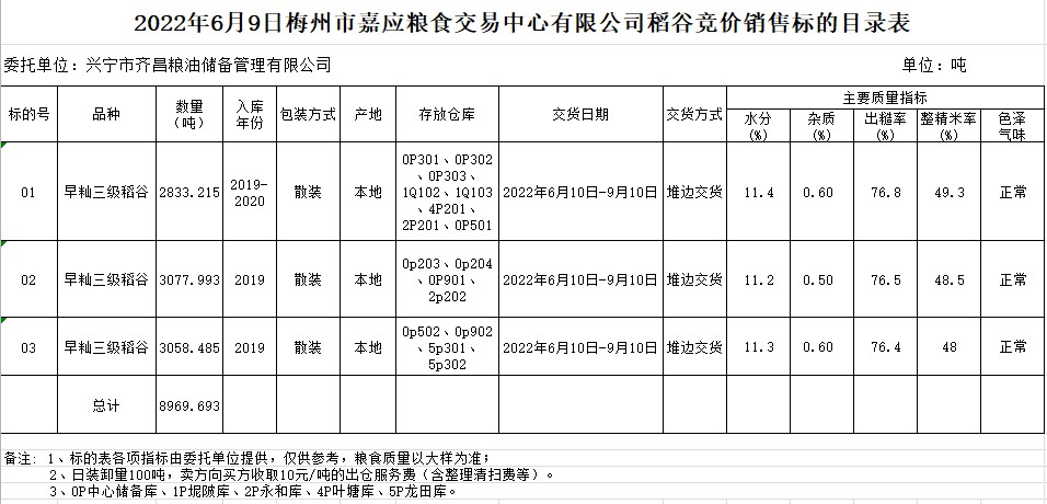 受客戶委托,梅州市嘉應糧食交易中心有限公司定于2022年6月9日(星期四)舉辦糧食競價交易會。興寧市齊昌糧油儲備管理有限公司擬銷售2019、2020年早秈稻8969.693噸。