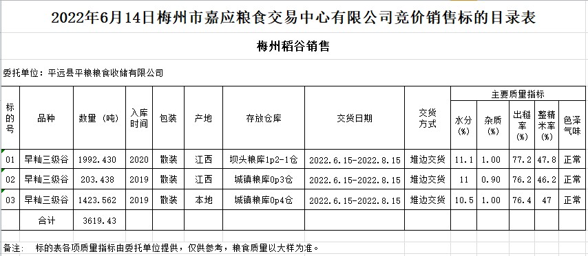 受客戶委托,梅州市嘉應糧食交易中心有限公司定于2022年6月14日(星期二)舉辦糧食競價交易會。平遠縣平糧糧食收儲有限公司擬銷售2019、2020年早秈稻3619.43噸。