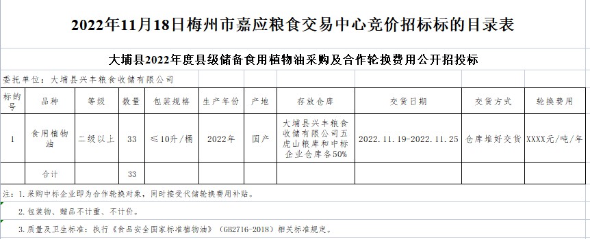 大埔縣2022年度縣級儲備食用植物油采購及合作輪換費(fèi)用公開招投標(biāo)公告