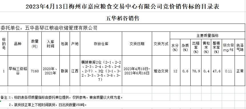 受客戶(hù)委托,梅州市嘉應(yīng)糧食交易中心有限公司定于2023年4月13日(星期四)舉辦糧食競(jìng)價(jià)交易會(huì)。五華縣琴江糧油收儲(chǔ)管理有限公司擬銷(xiāo)售2020、2021年早秈稻7160噸。