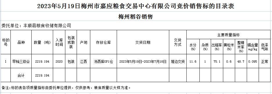 受客戶委托,梅州市嘉應(yīng)糧食交易中心有限公司定于2023年5月19日(星期五)舉辦糧食競(jìng)價(jià)交易會(huì)。豐順縣糧食收儲(chǔ)有限公司擬銷(xiāo)售2020年早秈稻2219.194噸。