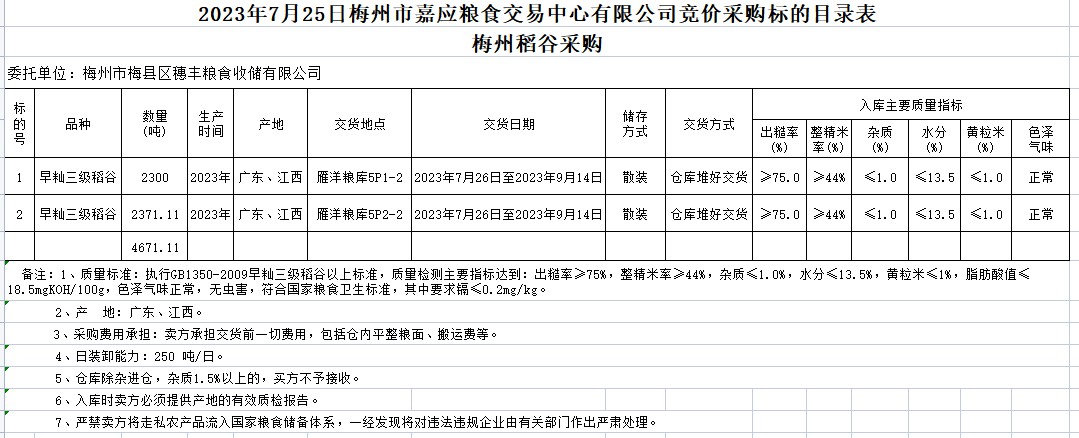 受客戶委托,梅州市嘉應(yīng)糧食交易中心有限公司定于2023年7月25日(星期二)舉辦糧食競價交易會。梅州市梅縣區(qū)穗豐糧食收儲有限公司擬采購2023年早秈稻4671.11噸。