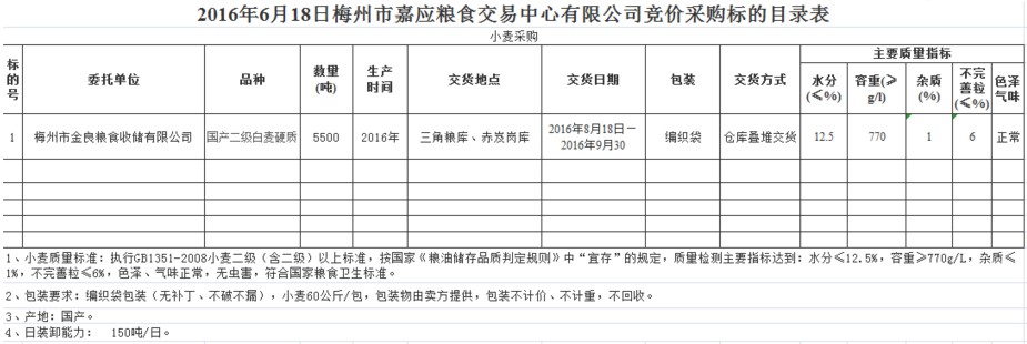 受客戶委托,梅州市嘉應(yīng)糧食交易中心有限公司定于2016年8月18日舉辦糧食競價(jià)交易會,梅州市金良糧食收儲有限公司擬采購2016年產(chǎn)二級硬質(zhì)小麥5500噸。