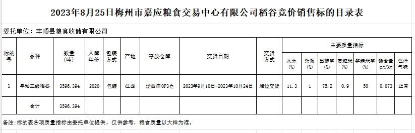 受客戶委托,梅州市嘉應(yīng)糧食交易中心有限公司定于2023年8月25日(星期五)舉辦糧食競(jìng)價(jià)交易會(huì)。豐順縣糧食收儲(chǔ)有限公司擬銷(xiāo)售2020年早秈稻3596.394噸。