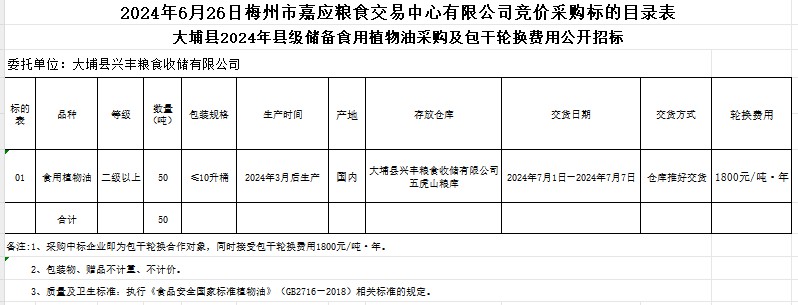 受大埔縣興豐糧食收儲有限公司委托,梅州市嘉應(yīng)糧食交易中心有限公司定于2024年6月26日(星期三)上午10時在廣東省梅州市彬芳大道南161號梅州市糧食交易中心3樓,舉辦大埔縣2024年縣級儲備食用植物油采購及包干輪換費(fèi)用公開招標(biāo)。