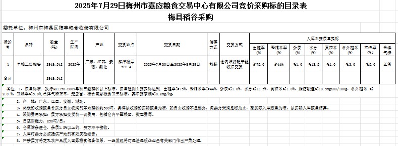 受客戶(hù)委托,梅州市嘉應(yīng)糧食交易中心有限公司定于2025年7月29日(星期二)舉辦糧食競(jìng)價(jià)交易會(huì)。梅州市梅縣區(qū)穗豐糧食收儲(chǔ)有限公司擬采購(gòu)2025年產(chǎn)早秈稻谷2949.542噸。