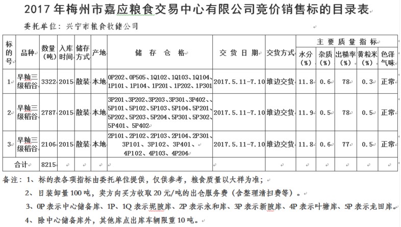 受客戶委托,梅州市嘉應(yīng)糧食交易中心有限公司定于2017年5月10日舉辦糧食競價(jià)交易會,興寧市糧食收儲公司擬銷售2015年早秈三級稻谷8215噸。(僅限現(xiàn)場交易)
