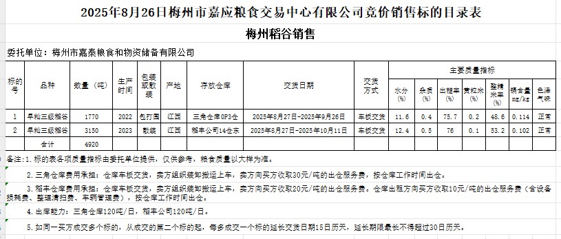 受客戶委托,梅州市嘉應(yīng)糧食交易中心有限公司定于2025年8月26日(星期二)舉辦糧食競價(jià)交易會。梅州市嘉泰糧食和物資儲備有限公司擬銷售2022年、2023年產(chǎn)早秈稻谷4920噸。