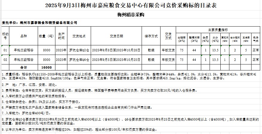 2025年9月3日梅州市嘉泰糧食和物資儲(chǔ)備有限公司稻谷采購(gòu)
