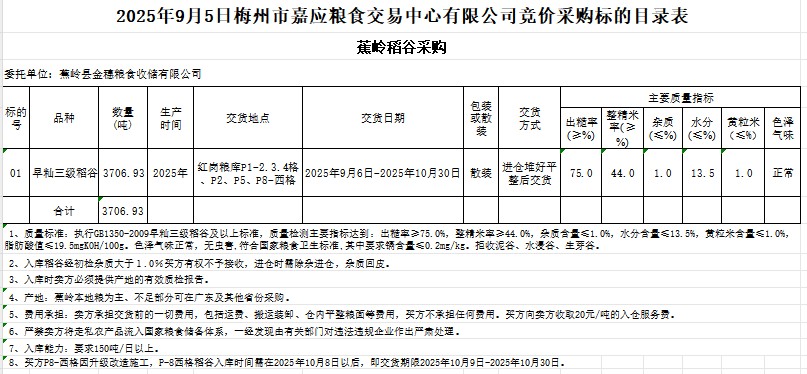 受客戶(hù)委托,梅州市嘉應(yīng)糧食交易中心有限公司定于2025年9月5日(星期五)舉辦糧食競(jìng)價(jià)交易會(huì)。蕉嶺縣金穗糧食收儲(chǔ)有限公司采購(gòu)2025年產(chǎn)早秈稻谷3706.93噸。