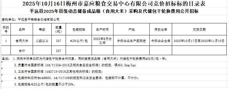 平遠(yuǎn)縣2025年縣級(jí)動(dòng)態(tài)儲(chǔ)備成品糧(食用大米)采購及代儲(chǔ)包干輪換費(fèi)用公開招標(biāo)公告