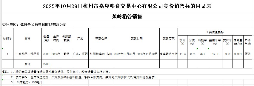 受客戶委托,梅州市嘉應(yīng)糧食交易中心有限公司定于2025年10月29日(星期三)舉辦糧食競價交易會。蕉嶺縣金穗糧食收儲有限公司擬銷售2023年產(chǎn)中晚秈稻谷2200噸。
