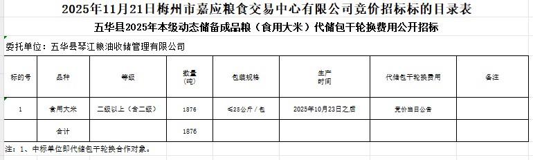 五華縣2025年本級動態(tài)儲備成品糧(食用大米)采購及代儲包干輪換費用公開招標(biāo)公告