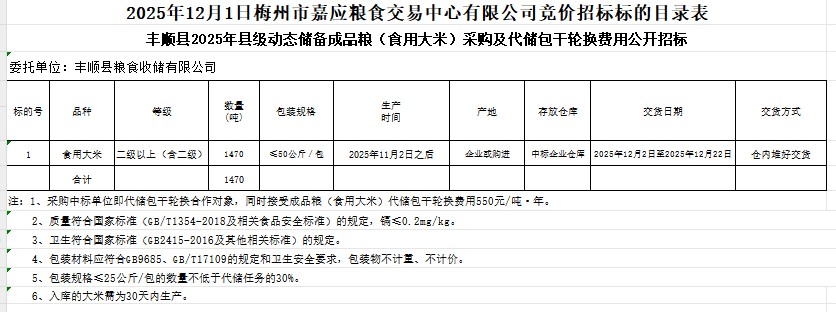 豐順縣2025年縣級(jí)動(dòng)態(tài)儲(chǔ)備成品糧(食用大米)采購(gòu)及代儲(chǔ)包干輪換費(fèi)用公開招標(biāo)公告