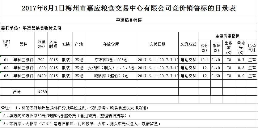 受客戶委托,梅州市嘉應(yīng)糧食交易中心有限公司定于2017年6月1日舉辦糧食競價交易會,平遠(yuǎn)縣糧食收儲公司擬銷售2015年早秈三級稻谷4289噸。