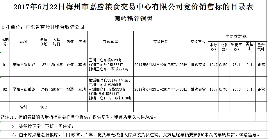 受客戶委托,梅州市嘉應(yīng)糧食交易中心有限公司定于2017年6月22日舉辦糧食競(jìng)價(jià)交易會(huì),廣東省蕉嶺縣糧食收儲(chǔ)公司擬銷(xiāo)售2014、2015年早秈三級(jí)稻谷共3619噸。