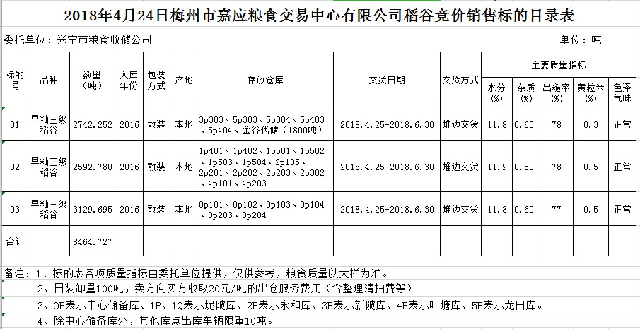 交易時(shí)間和地點(diǎn):2018年4月24日(星期二)上午10時(shí)。廣東省梅州市彬芳大道南161號梅州市糧食交易中心3樓。