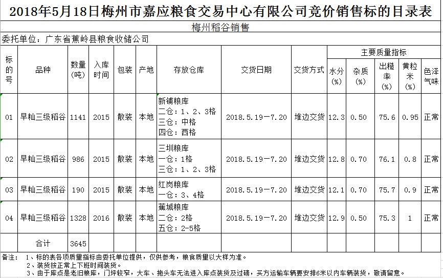 受客戶(hù)委托,梅州市嘉應(yīng)糧食交易中心有限公司定于2018年5月18日(星期五)舉辦糧食競(jìng)價(jià)交易會(huì),廣東省蕉嶺縣糧食收儲(chǔ)公司擬銷(xiāo)售早秈稻3645噸。