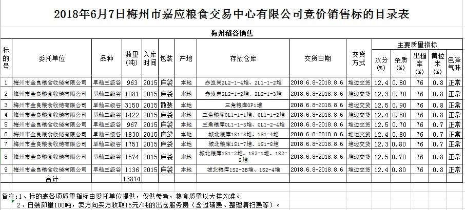 受客戶委托,梅州市嘉應(yīng)糧食交易中心有限公司定于2018年6月7日(星期四)舉辦糧食競價(jià)交易會,梅州市金良糧食收儲有限公司擬銷售早秈稻13874噸。