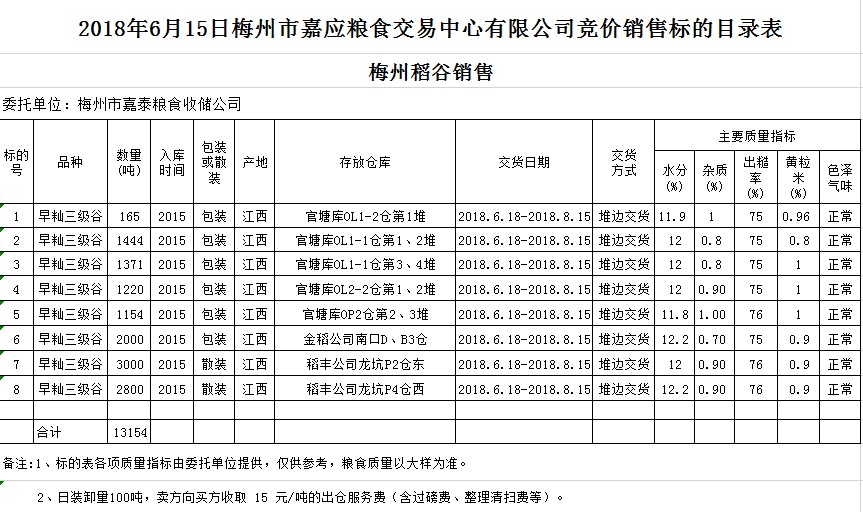 受客戶委托,梅州市嘉應(yīng)糧食交易中心有限公司定于2018年6月15日(星期五)舉辦糧食競價交易會,梅州市嘉泰糧食收儲公司擬銷售早秈稻13154噸。