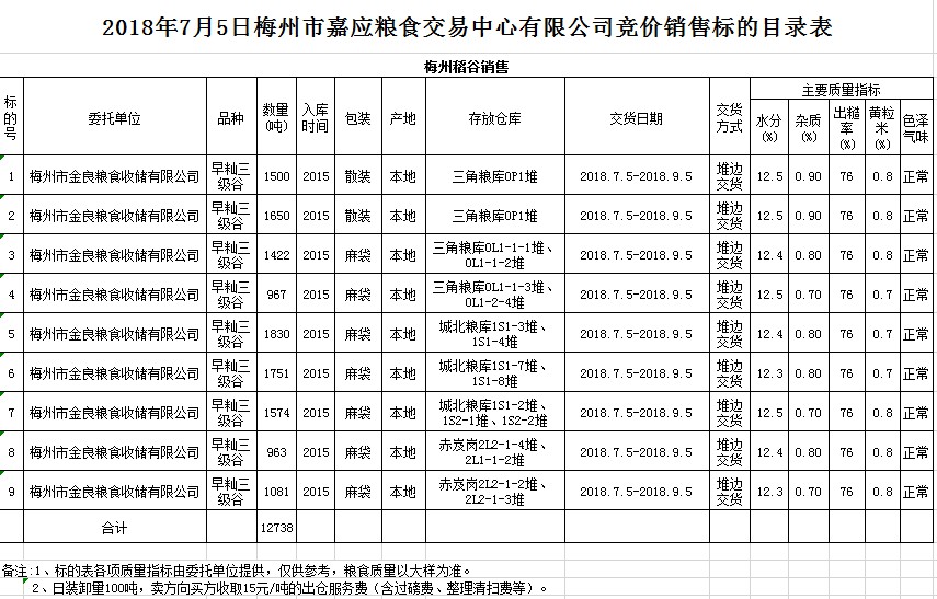受客戶委托,梅州市嘉應(yīng)糧食交易中心有限公司定于2018年7月5日(星期四)舉辦糧食競(jìng)價(jià)交易會(huì),梅州市金良糧食收儲(chǔ)有限公司擬銷(xiāo)售早秈稻12738噸。